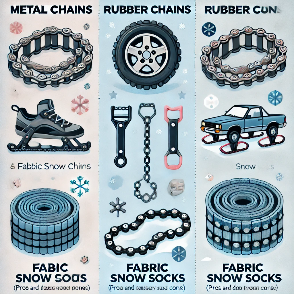 스노우 체인은 여러 종류가 있으며, 각기 다른 장점과 단점이 있습니다. 자신이 주행할 환경에 맞는 제품을 선택하는 것이 중요합니다.