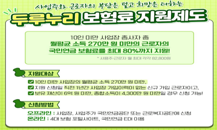 소규모 사업장의 가장 큰 부담 중 하나는 바로 4대 보험료입니다. 직원들의 국민연금과 고용보험 가입은 필수지만, 사업주와 근로자가 각각 부담해야 하는 보험료가 만만치 않기 때문입니다. 특히 영세 사업장과 저소득 근로자의 경우, 보험료 부담으로 인해 사회보험 가입을 포기하는 경우도 많습니다. 이를 해결하기 위해 정부에서는 두루누리 사회보험료 지원금 제도를 운영하고 있습니다 이번 글에서는 두루누리 지원금의 지원 대상, 신청 방법, 혜택, 주의사항 등을 상세히 알아보고, 어떻게 하면 보험료 부담을 줄이고 혜택을 최대한 활용할 수 있는지 알려드리겠습니다.