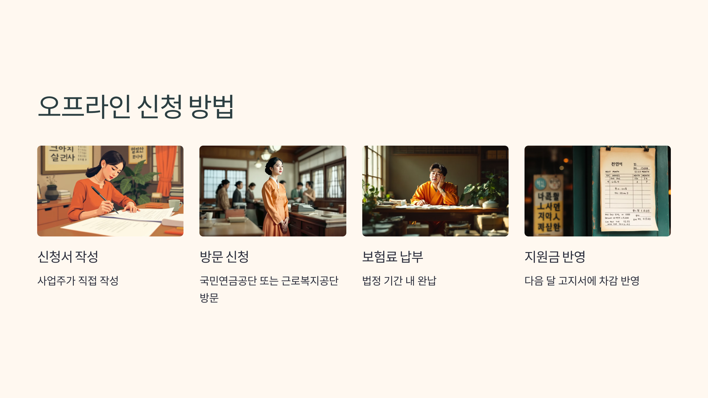 사업주는 직접 지원 신청서를 작성한 후, 국민연금공단 또는 근로복지공단을 방문하여 신청해야 합니다. 이후, 법정 기간 내에 보험료를 완납하면, 해당 월의 지원금만큼 차감된 금액이 다음 달 고지서에 반영됩니다.