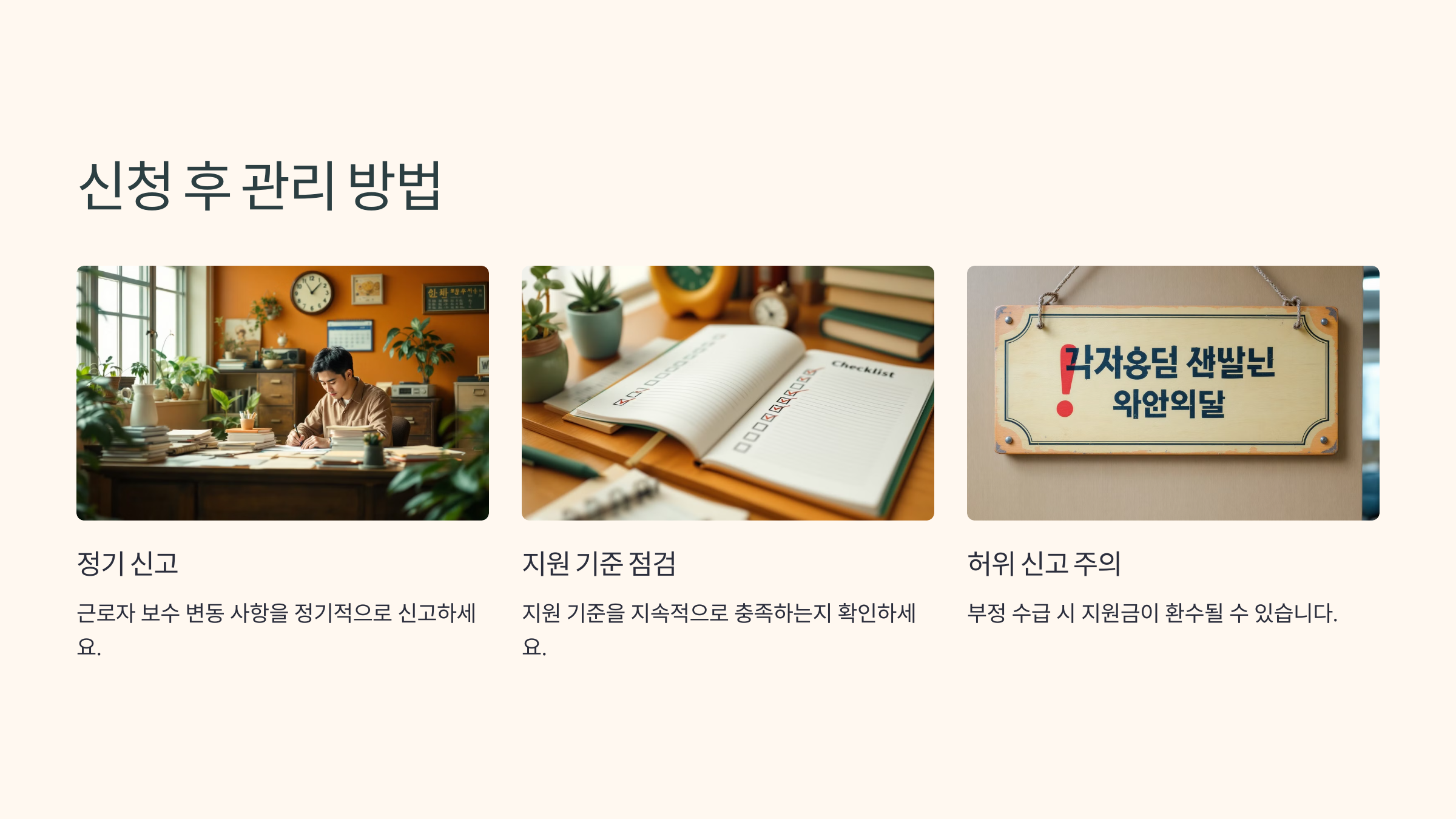 두루누리 지원금을 신청한 후에는 정기적으로 근로자의 보수 변동 사항을 신고해야 하며, 이를 소홀히 할 경우 지원 대상에서 제외될 수 있습니다. 또한, 허위 신고나 부정 수급이 적발될 경우 지원금이 환수 조치될 수 있으며, 추후 지원 신청에도 제한이 발생할 수 있으므로 주의해야 합니다. 지원금을 계속해서 받기 위해서는 사업장에서 근로자의 급여 변동 사항을 정확히 신고하고, 지원 기준을 지속적으로 충족하는지 점검하는 것이 중요합니다.