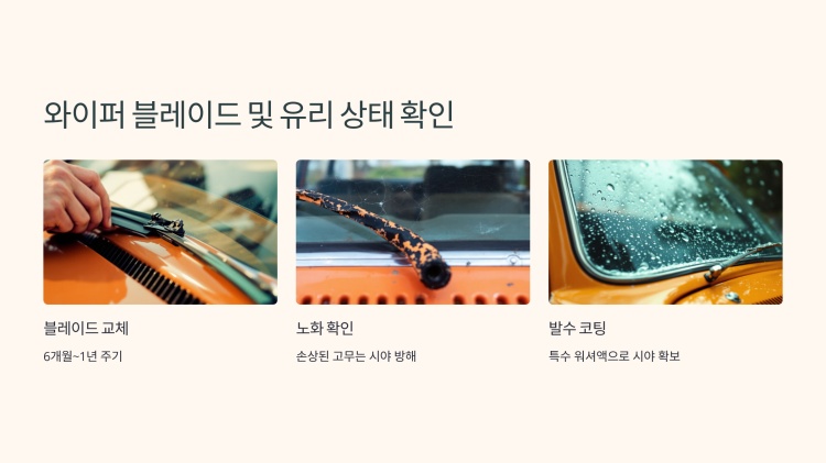 장마철을 대비하여 와이퍼 블레이드의 상태를 확인하는 것이 중요합니다. 고무 블레이드가 노화되거나 손상되면 빗물을 제대로 제거하지 못해 시야 확보에 어려움을 줄 수 있습니다. 일반적으로 와이퍼는 6개월에서 1년 주기로 교체하는 것이 권장됩니다. 또한 유리에 발수 코팅을 하거나 발수 기능이 있는 워셔액을 사용하여 시야 확보를 도울 수 있습니다.