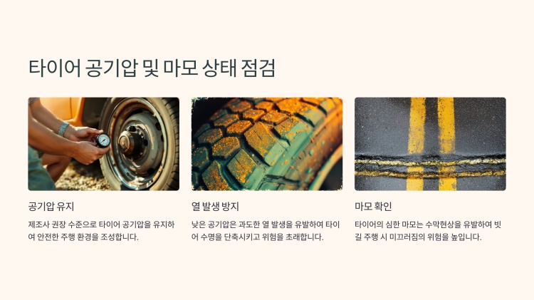 여름철 뜨거운 노면은 타이어에 직접적인 영향을 미칩니다. 타이어 공기압이 적정 수준보다 낮으면 회전 저항과 접지면이 커져 과도한 열이 발생할 수 있습니다. 따라서 제조사가 권장하는 공기압을 유지하는 것이 중요합니다. 또한 타이어 마모가 심하면 빗길 주행 시 배수 능력이 떨어져 수막현상이 발생할 수 있으므로, 정기적인 마모 상태 확인과 필요시 교체를 권장합니다. \