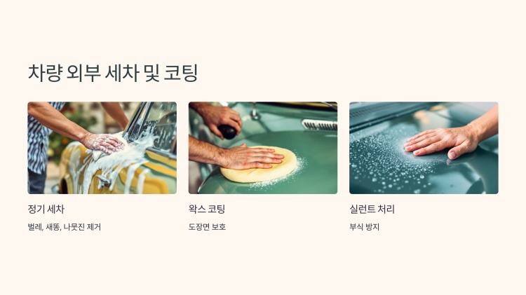 여름철에는 벌레 잔해, 새똥, 나뭇진 등이 차량 외부에 쉽게 묻을 수 있습니다. 이를 방치하면 도장면이 손상되거나 부식될 수 있으므로, 주기적인 세차와 왁스 또는 실런트 코팅을 통해 차량 외관을 보호하는 것이 좋습니다.