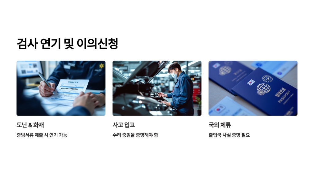 - 관련 증빙서류 제출 시 검사 연기 가능