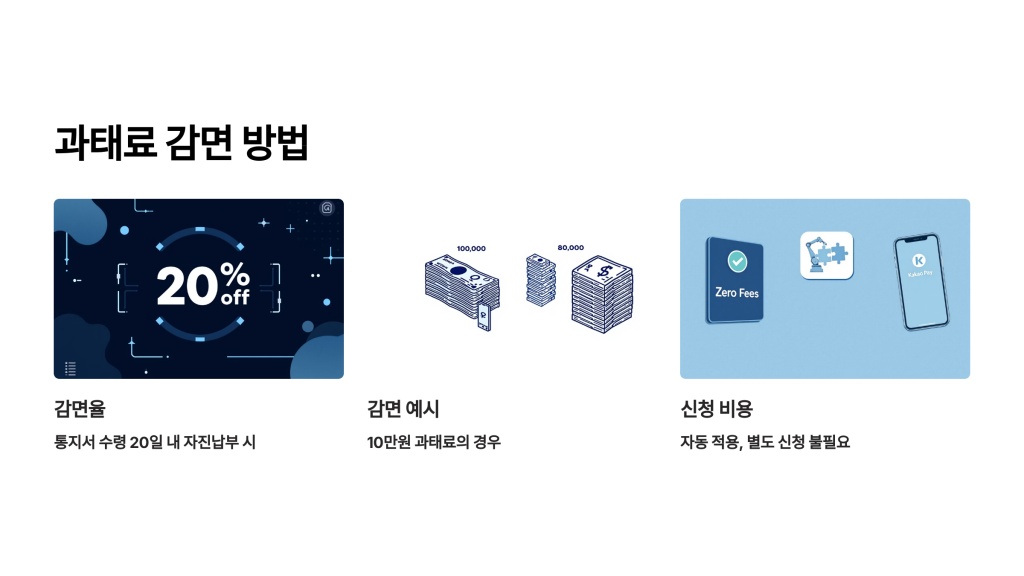 예를 들어 과태료가 10만 원이라면 자진 납부 시 2만 원이 감면되어 8만 원만 납부하면 되며, 따로 감면 신청을 하지 않아도 자동으로 감경 금액이 적용됩니다.