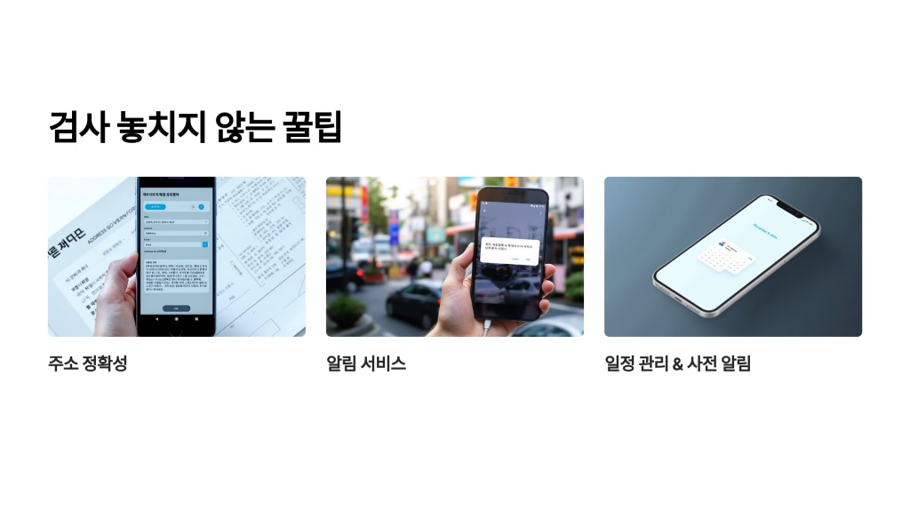 - 차량 등록지 주소가 정확한지 확인하고 이사했다면 즉시 변경해 검사 안내문을 받을 수 있도록 합니다.
