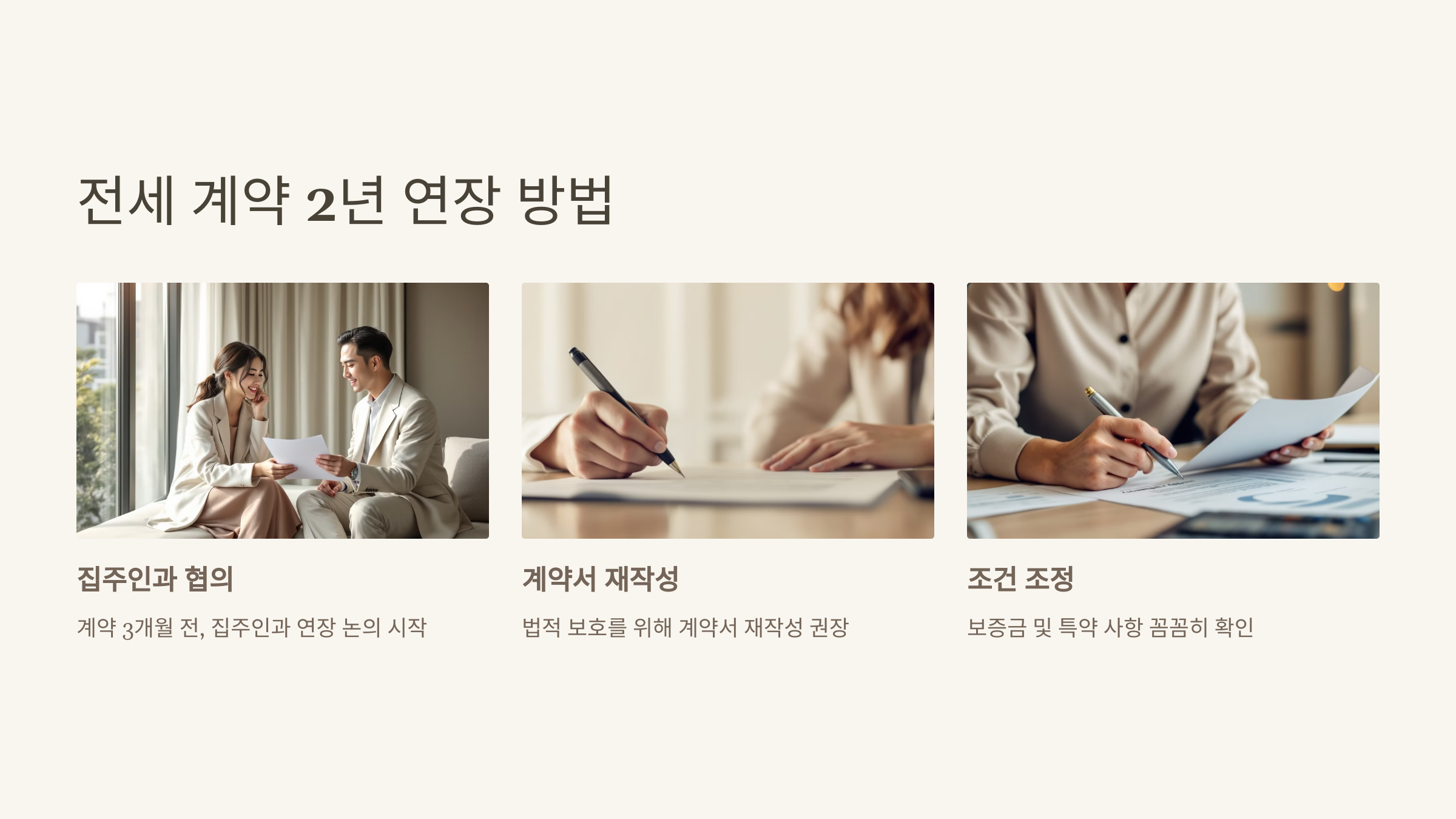 - 계약서에 연장된 기간, 보증금 조정 내용, 기타 특약 사항을 명확히 기재하세요.
