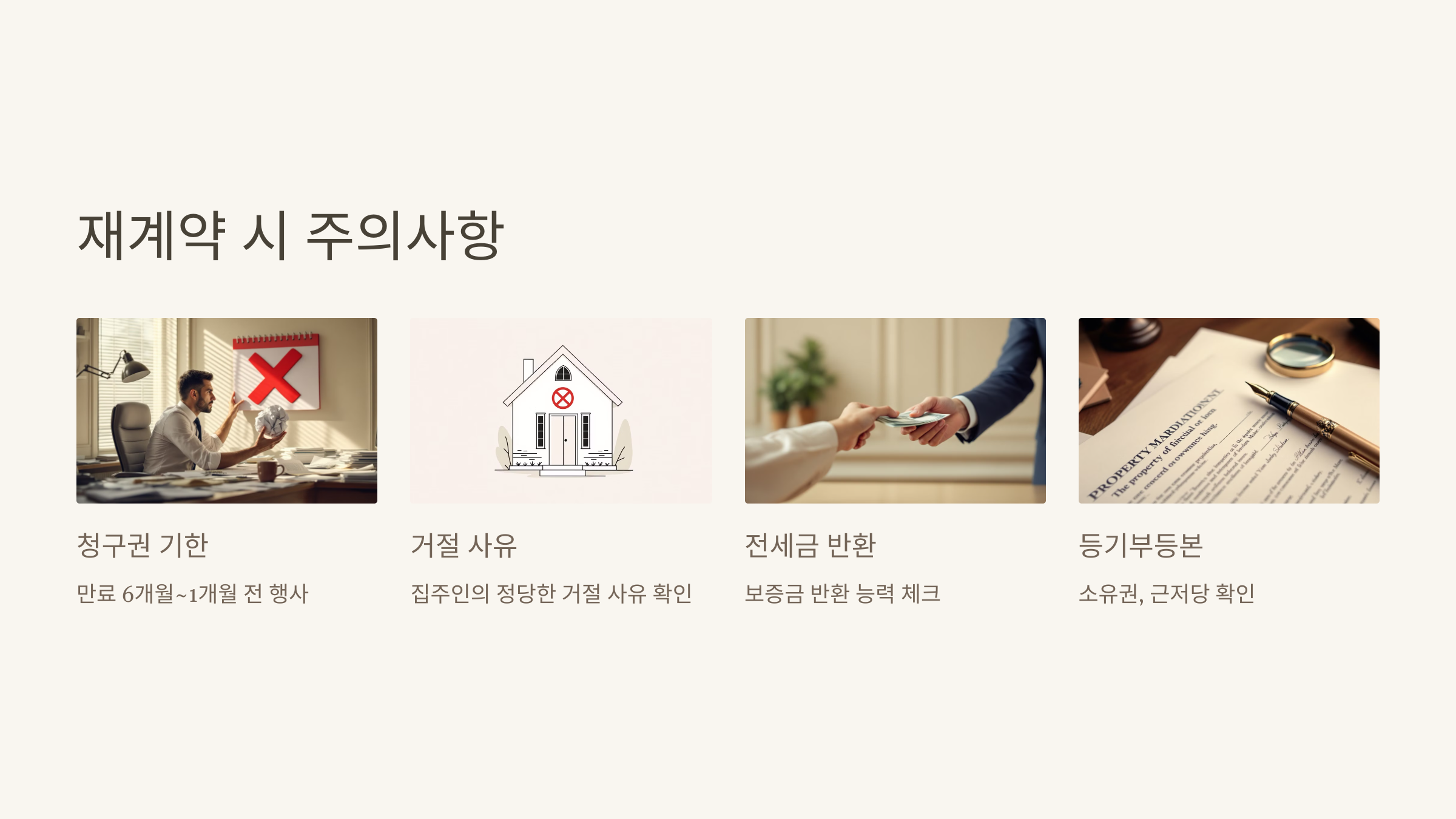 - 계약 연장을 원하면 계약갱신청구권을 행사할 것인지 여부도 고민해야 합니다.