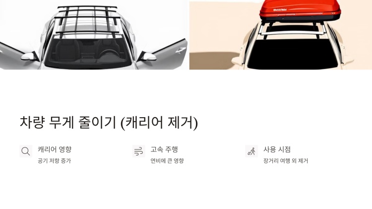 지붕 위에 캐리어나 루프박스를 달고 다니면 공기 저항이 증가해 연비가 나빠져요. 장거리 여행 외에는 가급적 제거해 두는 것이 좋습니다.