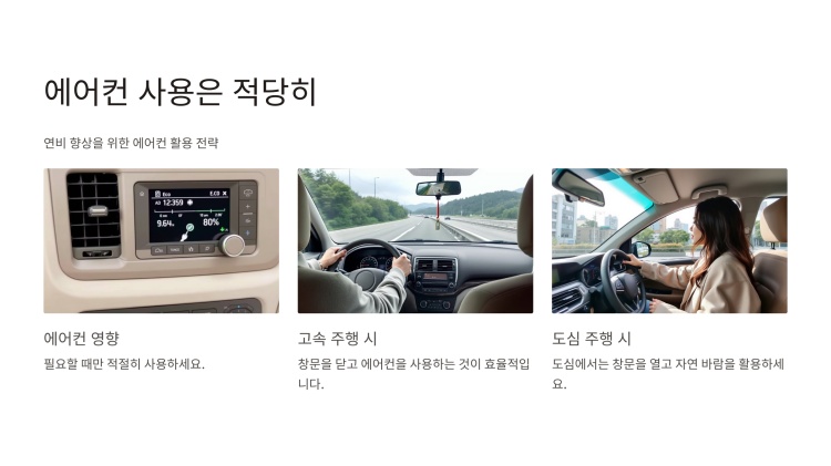 ✅ 고속 주행 중에는 창문을 닫고 에어컨을, 도심 주행 중엔 창문을 여는 방식으로 조절하세요.