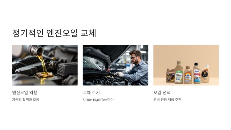 엔진오일은 차량의 혈액과도 같은 존재입니다. 오래된 오일은 엔진 마찰을 늘리고 연료 소비를 증가시키기 때문에 5,000~10,000km마다 교체하는 게 좋아요.