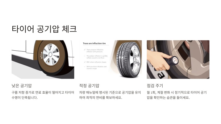 타이어의 공기압이 낮으면 구름 저항이 증가해 연비가 하락합니다. 정기적으로 공기압을 점검하고, 차량 매뉴얼에 적힌 적정 공기압을 유지하세요.