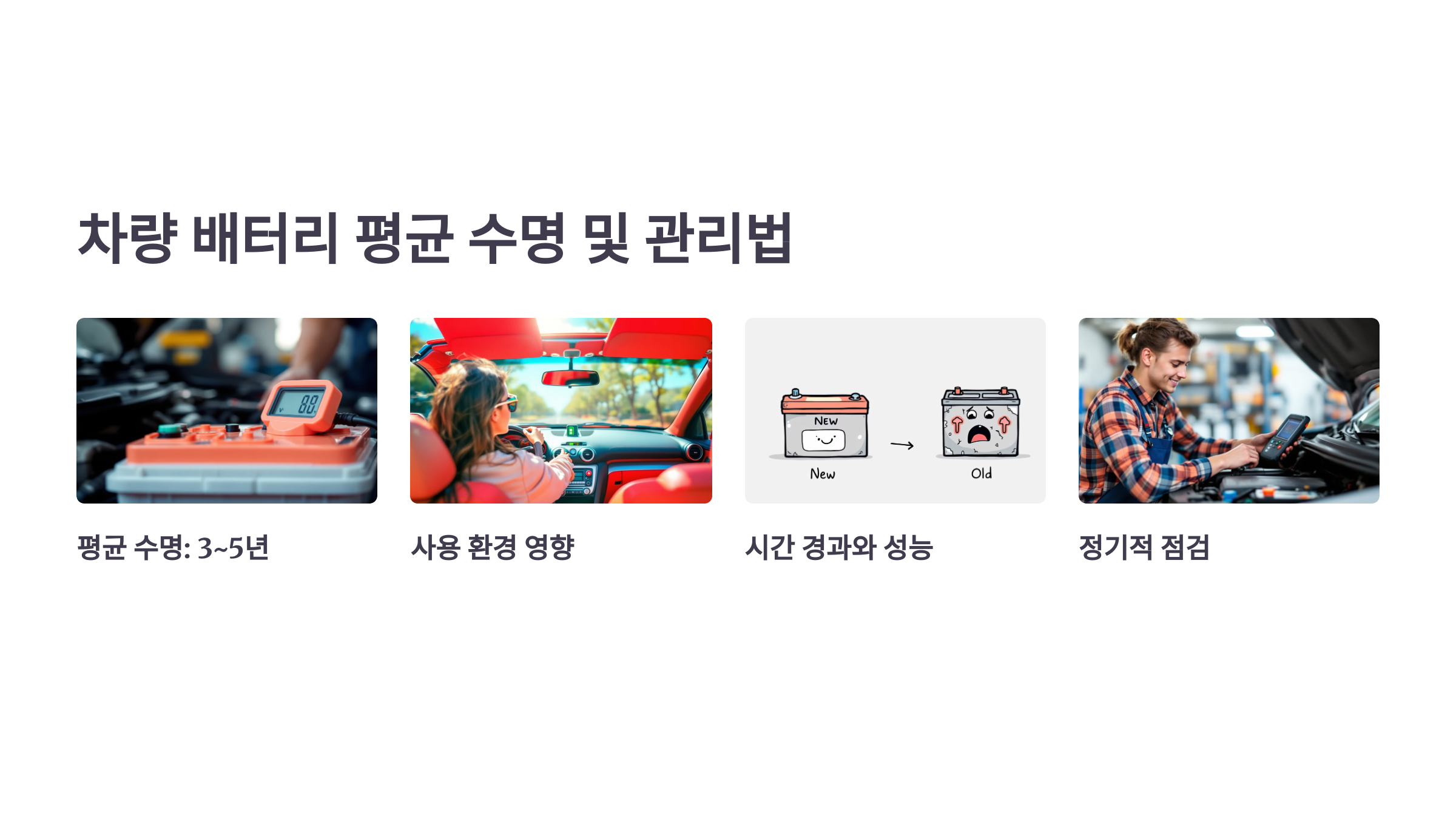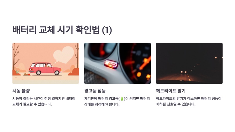운전을 하다 보면 시동이 갑자기 걸리지 않거나, 계기판에 배터리 경고등이 켜지는 경험을 한 적이 있으실 것입니다. 자동차 배터리는 시간이 지나면서 성능이 저하되기 때문에 일정 주기마다 교체가 필요합니다. 하지만 정확한 교체 시기를 알지 못하면 예상치 못한 방전으로 인해 불편을 겪을 수 있습니다. 이번 글에서는 차량 배터리 교체 주기에 대해 자세히 알아보고, 배터리 수명을 연장하는 방법까지 자세히 알아보겠습니다.