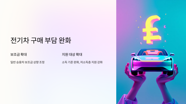- 청년 생애 첫 전기차 구매: 기존 차상위 계층 조건 없이 보조금 20% 추가 지원.